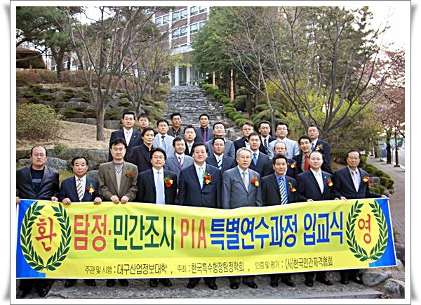 2008년 4월 11일 대구산업정보대학교 경찰행정학과 민간경비교육센터에서 PIA 특별연수과정 18기 입교식을 하게 되었습니다. 모든 입교생들께서 8주간의 이론 및 실기교육을 무사히 마치고 전원 수료식에서 뵐수 있기를 바랍니다. 원본사진을 원하시는 입교생들께서는 저희 학회로 연락을 주시면 원본사진을 보내드리겠습니다. |