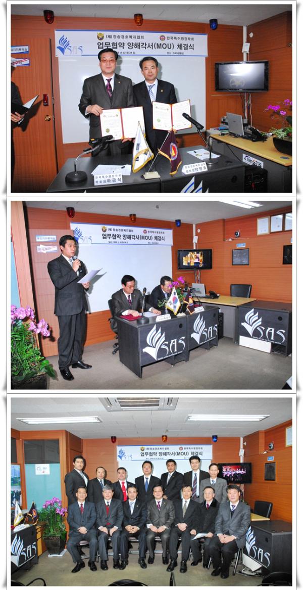 ![]() ![]() 2009년 2월 24일 당 학회와 (재)정송경호복지협회 및 엘림STB와 상호 협력체계를 구축하였습니다. 이번 산학협력을 바탕으로 유기적 연대를 확립하며, 학술연구, 교육, 전문기술 장비 및 학술지식은 물론 탐정, 민간조사, 경호, 경비 전문과정을 협력 교류하였습니다. 앞으로 더 나은 한국특수행정학회가 되도록 노력하겠습니다. |