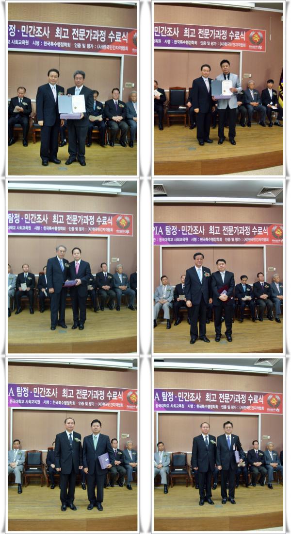 ![]() ![]() 지난 5월 1일 동국대학교 사회교육원에서 PIA 민간조사관 22기 입교식을 시작으로 10주간 이론교육, 실습교육을 모두 마치고 7월4일 수료식을 하였다. 이번 수료식에는 내,외빈 및 군,경찰 전,현직, 각 단체장들의 참석으로 한층 더 빛난 수료식이 되었다. PIA 22기를 배출한 학회에서는 PIA 요원들을 대상으로 대한민간조사협회를 창단하여 한국의 탐정, 민간조사 분야의 한 획을 그을수 있을것이라는 기대감을 가지고 있다. |
