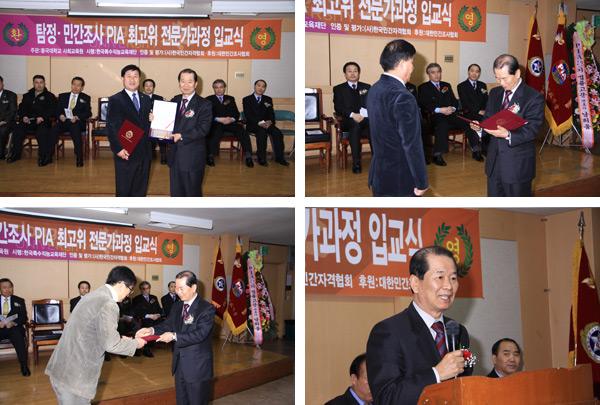 ![]() ![]() 한국특수직능교육재단이 주관하며 동국대학교 사회교육원에서 실시한 PIA 탐정 민간조사 최고위(CEO)과정이 2011년 1월 21일 금요일 오후5시에 동국대학교 문화관 1층 덕암세미나실에서 입교식이 진행됐다. |