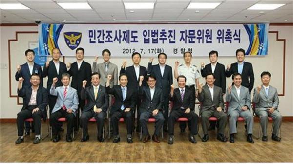 (위촉식 및 입법추진을 위한 정책토론 행사를 마치고 기념촬영) ‘2012년 7월 17일(화) 오전 10시반부터 경찰청에서는 경찰청 수사기획관을 비롯한 6개 담당관(과장)과 7개 대학 경찰행정학과 교수 및 관련 민간단체 5개 대표 등 총 18명이 참석한 가운데 민간조사제도 입법추진을 위한 자문위원 위촉식이 개최되어 위촉장 수여 및 입법추진 계획, 정책제언 등이 발표 되었습니다. |