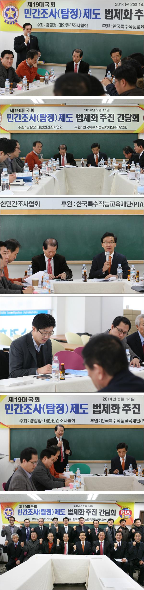 2014년 2월 14일 한국특수직능교육재단/대한민간조사협회과 경찰청 주관으로 “민간조사(탐정) 제도 법제화 추진 간담회”가 종로 본 교육재단 소회의실에서 정계, 관련학계 전문가들을 비롯하여 여러 내외빈이 참가한 가운데 성황리에 거행되었습니다. 이날 간담회는 이인기(前 국회 행정안전위원회 위원장), 강영규(대한민간조사협회 총재), 이상원(대한민간조사연구학회 회장), 박준석(한국경호경비학회 회장), 조달환(사단법인 경비지도사협회 회장), 이상철(한국시큐리티정책학회 회장), 하금석(한국특수직능교육재단 이사장), 손상철(한국시큐리티연구소 소장) 등의 축사와 격려사로 진행되었으며 특히 민간조사(탐정) 분야를 연구하는 관련 학과 교수님들도 참석하여 열띤 토론을 벌이며 많은 관심을 불러일으켰습니다. 이날 간담회에 경찰청 대표로 참석한 現 경찰청 수사과 이연욱 경감은 민간조사업법 추진 경찰청 주무담당자로 19대국회에서 입법을 추진함에 따른 경찰청의 활동 방향에 대하여 설명하면서 참석자들의 많은 관심을 가져왔습니다. 그리고 참석자들은 민간조사(탐정) 제도의 소관부처의 향방, 법제화가 실현됐을 이후의 득실, 그리고 국민 생활에 미칠 영향 등에 대한 열띤 토론을 펼치느라 시간 가는줄을 몰랐습니다. 또한 19대 국회에서 새누리당 윤재옥 국회의원에 의해 발의된 민간보안산업법에 대하여 발표자 및 토론자들은 크나큰 관심과 기대를 보였습니다. |