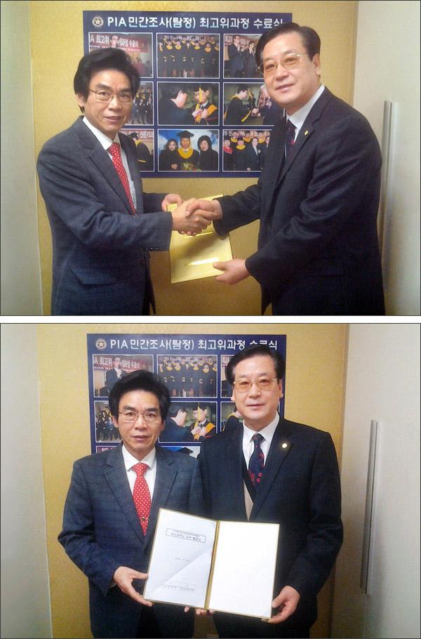 ![]() ![]() 2015년 1월 24일 한국의 민간조사 교육사업 확장의 일환으로 동의대학교와 PIA 최고위과정 산학업무 협약이 본 협회 회의실에서 열렸습니다. 이 자리에는 동의대학교 사회과학부 여순모 교수와 PIA협회 하금석 회장 등이 참석하여 2015학기부터는 서울뿐 아니라 부산에서도 PIA 최고위과정이 실시되는데에 합의를 하였습니다. 전국적으로 뻗어가는 PIA 민간조사 교육의 앞날이 오래오래 번창할 수 있도록 회원님들의 끊임없는 관심 부탁드립니다. |