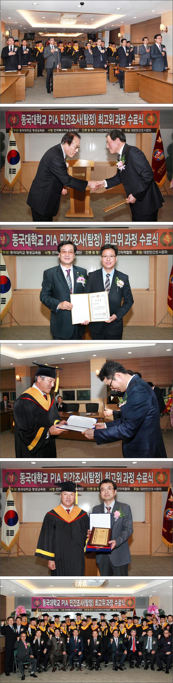 ![]() ![]() 2015년 11월 6일(금요일) 서울 동국대학교 본관 로터스홀에서 관련기관 단체장은 물론, 정·재계, 학계, 지도교수 등이 참석한 가운데 동국대학교 PIA 민간조사(탐정) 제56기 최고위과정 수료식이 거행되었습니다. 이날 수료식에는 동국대학교 평생교육원 박선형 원장, 한국특수직능교육재단 정학균 총장, 대한민간조사협회 하금석 회장 등이 참석하여 수료식 행사를 진행하였으며 아울러 내·외빈 및 지도교수, 교육생 등 50여명이 참석하여 PIA 민간조사 최고위과정에 대한 높은 관심을 보여주었으며, 수료식 행사를 마치고 수료생들과 석별의 정을 나누며 앞으로 PIA 회원으로서 친목도모와 상호 정보 교류는 물론 협회 발전에 최선 다하기로 다짐하였습니다. PIA 자격증은 민간조사 관련 자격으로는 자격기본법 제17조 의거 교육과학기술부 산하 한국직업능력개발원에 등록(제2009-0001호)되어 국내에서는 유일하게 한국특수직능재단에서 10여년째 발행해오고 있졌습니다. PIA 민간조사 자격증 취득 최고위과정은 서울 동국대학교, 부산 동의대학교, 대구 수성대학교 등 전국 각지에서 실시하고 있으며, 이 과정을 수료하면 대학교 총장 명의의 교육수료증 및 수료패와 PIA 자격증 및 자격인증서, PIA 신분증 등을 부여받으며 PIA 자격취득에 따른 기타 각종 특전 혜택을 얻을 수 있습니다. 본 PIA 자격 취득자들의 활동 분야는 전문직으로 일반기업체 보안팀 및 법무감사팀, 보험회사 사고조사반, 신용정보회사, NGO단체, 변호사 및 법무사 사무소등 관련업종 취업은 물론 현행 법률이 허용하는 범위에서 민간조사 개인사무실 및 법인 창업과 프리랜서 활동이 가능한 것으로 알려졌습니다. 이 PIA 민간조사(탐정) 자격은 국내에서 유일한 민간조사 관련 전문 자격증으로 자격기본법에 의거 등록된 자격증이며, 일부 타 대학교에서 실시하는 민간조사 과정은 민간조사 관련 자격증을 취득할 수 없으므로 교육신청시 주의가 요구됩니다. |