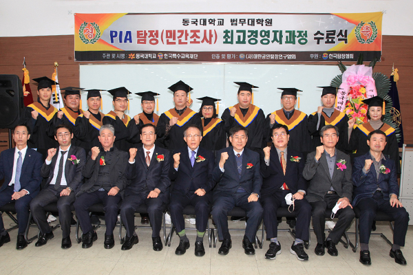 한국공인탐정협회/한국특수교육재단은 11월 27일 동국대학교 법무대학원에서 관련기관 전. 현직 단체장은 물론, 학계, 언론계, 지도교수 등이 참석한 가운데 PIA사설탐정사 동국대학교 법무대학원 PIA탐정 제75기 최고경영자과정 수료식을 거행하였습니다. |